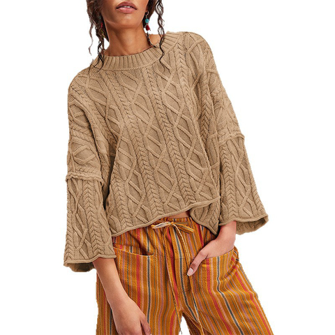 Kênh 100 Acrylic giản dị crewneck 3/4 Tay áo Chunky cáp đan Jumper 2025 của phụ nữ mùa thu mùa đông quá khổ áo thun áo len