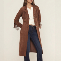 Kênh Chic 2025 Mùa Thu Mùa Đông Của Phụ Nữ Fringe Faux Da Lộn Dài Rãnh Áo Ve Áo Cổ Áo Nút Xuống Tua Chi Tiết Dài Áo Khoác