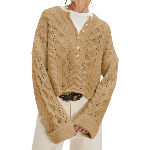 Kênh mới đến mùa thu 2025 thường lỏng phù hợp với phụ nữ Crew Neck nút phía trước Henley cổ cắt Áo Thun cáp đan Áo len