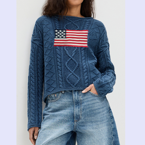 Kênh Chic dài tay áo Crew Neck đồ họa Y2K giản dị lỏng áo thun hàng đầu cho phụ nữ Mỹ cờ cáp đan mùa thu Áo len 2025