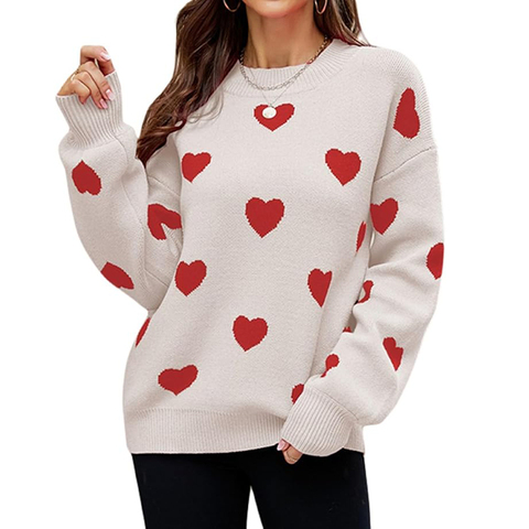 Kênh 2026 của phụ nữ dễ thương trái tim Áo len tình yêu in Valentine lãng mạn dệt kim hàng đầu giản dị crewneck dài tay áo len áo thun