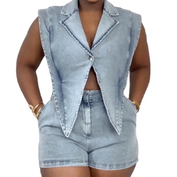 Kanal yaz zarif Denim düğme aşağı kolsuz ceket yelek kadınlar için üst ve şortlar takım setleri Jean iki parçalı Set kıyafetler