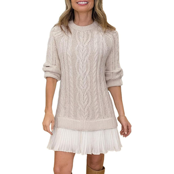 Channel 9สีเสื้อสเวตเตอร์คอกลมแขนยาวลำลองสำหรับผู้หญิง, สเวตเตอร์ถักสายคอกลมเดรสมินิสำหรับผู้หญิง2 in 1เดรสมีจีบ